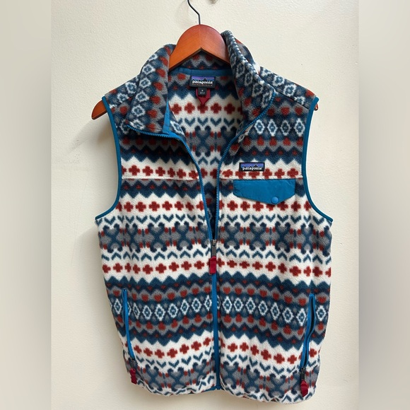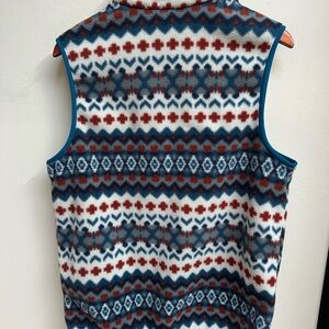 Warm fleece vest with geometric design. Features blue, red, and white tones. Ideal for outdoor adventures.
