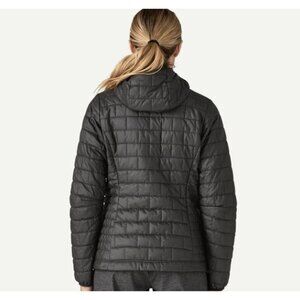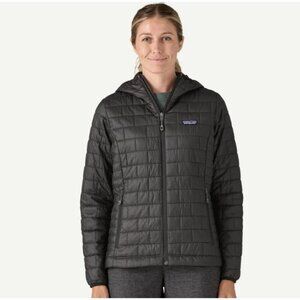 Patagonia Nano Puff Hoody Jacket Women's Size Medium in Black. Excellent pre owned condition, just two small pin holes on the bottom front left side as pictured, as well as 2 small scratches.