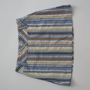 Size 10 Patagonia Netty Skirt Striped Seersucker Blue Green Brown Pockets. Keep cool in this simple low rise skirt. Lightweight recycled polyester organic cotton seersucker, with flattering wide waistband and back yoke. No stains or tears, just normal wash and wear.
