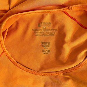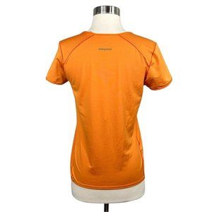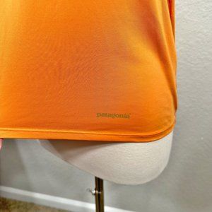 Patagonia Orange Short Sleeve Base Layer Top. Polyester/spandex. Perfect for hiking, camping, outdoor activities, etc. Gorpcore. Bright orange color. *AI model depiction of style.