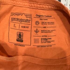 Patagonia organic cotton tee in Men’s Large. Slim fit, crew neck, soft jersey with the iconic 1973 mountain logo. Fair Trade Certified. Orange with multicolor print.