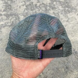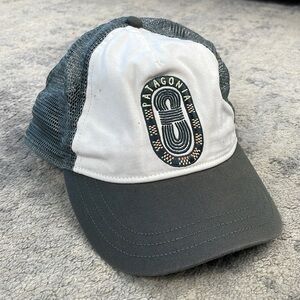 Patagonia trucker hat. Features a unique woven patch on the front, and a breathable mesh back. Adjustable snapback closure. Great for outdoor activities or everyday style.