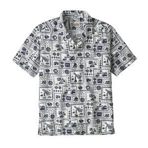 The Patagonia Pataloha Limited Edition Men's Shirt features a Hawaiian pattern with blue and white colors, short sleeves, a collared neckline, and a button closure. Made of organic cotton and silk, this regular fit shirt is a part of the Pataloha Limited Edition collection, showcasing a unique design of Opihi Man. The spread collar and button accents add to the stylish and retro appeal of this aloha-themed button-up shirt.