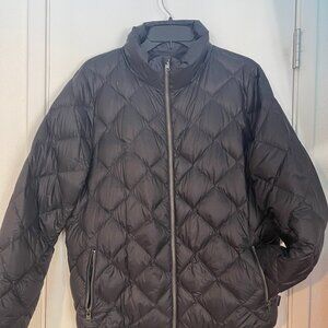 NWOT never worn. Recycled satin woven nylon shell fabric has a durable water repellent (DWR) finish to shed light rain; polyester lining glides easily over layers. Side handwarmer pockets with exposed faux-metal zippers. Rib-knit trim at cuffs and hem seals in warmth. Center-front faux-metal zipper and stand-up collar