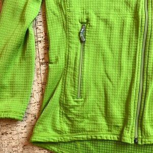 R1 grid fleece zip jacket. Some signs of wear on the sleeves (see photos) and and one small spot on the back of a sleeve- (see photos). Otherwise in good shape with lots of life left! These are great travel or active fleeces. Packable, warm, and can go from hike to town no problem! Zip pockets.