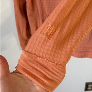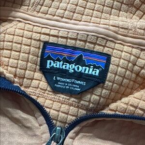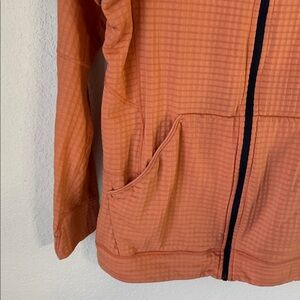 This jacket is a peach color. Lightweight R1 fleece lined style. Gently used condition. Size L. Bust is 21”, length is 26”.
