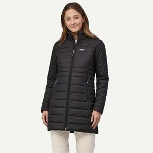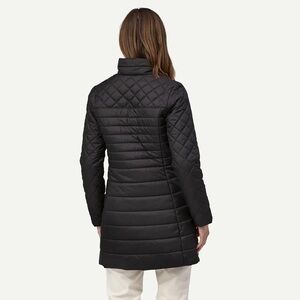 Patagonia Radalie Parka in black. A quilted, longline puffer coat designed for lightweight warmth and everyday wear. Features full zip closure, insulated fill, and sleek design that layers easily over sweaters or activewear. Durable, functional, and versatile. Perfect for winter, travel, or outdoor adventures.