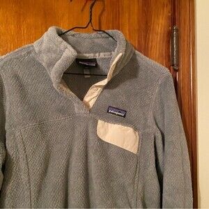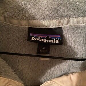 Patagonia women’s light or heather gray fleece jacket with dark cream off white accents in the re tool snap-t style. Comfy, soft, and cozy. Chest patch pocket. Size medium. In good condition with minimal signs of wear.