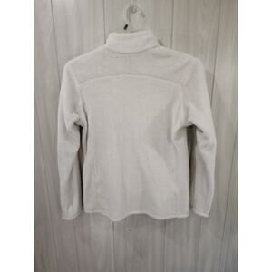 This Patagonia Re-Tool Snap-T Pullover Jacket is perfect for any girl who loves to travel, be active, attend parties, or simply dress casually. The jacket is made from 100% polyester and features a solid pattern in ivory color with button and logo accents. It has long sleeves and a pullover closure, making it easy to wear.
