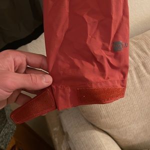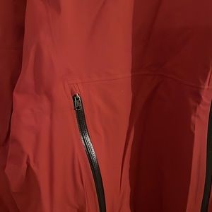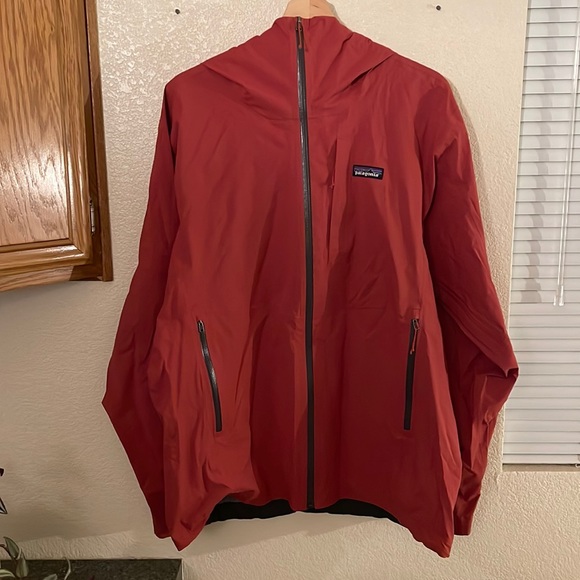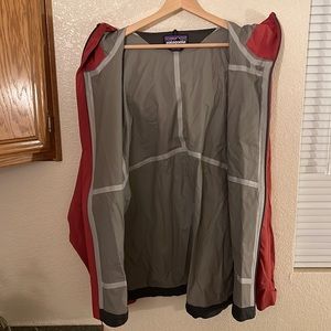 This is a lightweight rain jacket from Patagonia that is in excellent condition: all zippers working, tightening draw strings intact, and velcro handcuffs intact. The only flaw is the string missing on one of the zippers (shown in picture number two).