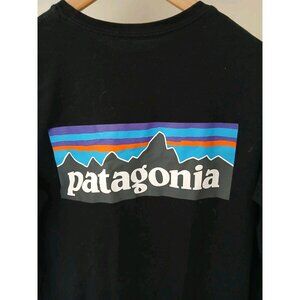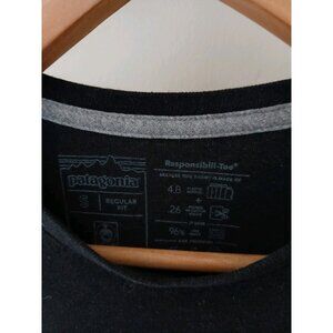 Patagonia Responsibili-tee Long Sleeve T-Shirt. Size small. Black with the Patagonia logo and Patagonia spelled out. Outdoors, gorpcore, camping. In nice, preowned condition. Minor cracking to graphic and light wash wear. Measures approximately 19" pit to pit, 27" shoulder to hem.