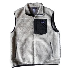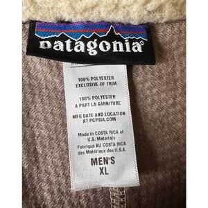 Elevate your retro style with this Patagonia vest in natural cream and brown tones. Crafted from soft and warm fleece, this vest features a cozy sherpa lining for added comfort. The XL size and regular fit make it perfect for men searching for a stylish and comfortable vest with a vintage vibe. The vest is adorned with the Patagonia logo on the chest, making it a must-have for brand enthusiasts. The polyester outer shell material ensures durability, making it suitable for outdoor adventures.