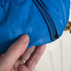 Blue with tan-brown lining, ruffle detail on front and back panels. Side zip pockets. No tears, but small indents-see photos. Stained areas, see photos. One snag, see photo. Otherwise, good used condition.