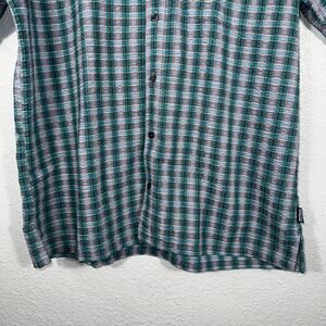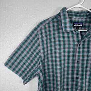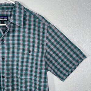 Patagonia Short Sleeve Button Down Men’s L Green Grey Plaid EUC