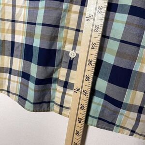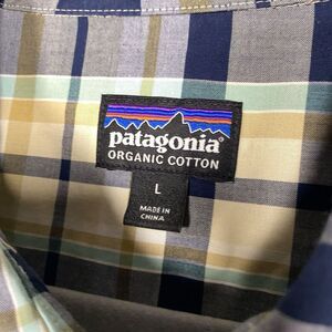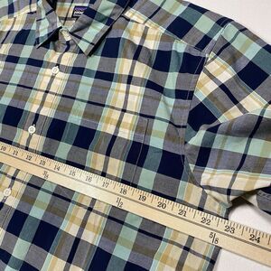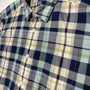 Patagonia Short Sleeve button down LARGE plaid Shirt Organic Cotton navy blue