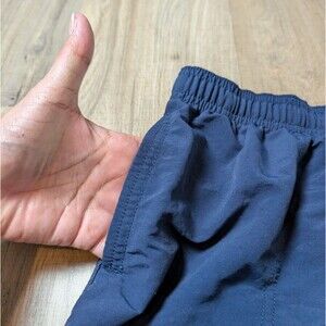 The product is a pair of Patagonia boys baggies shorts in a solid blue color with a drawstring closure and 5" inseam. The shorts are 100% nylon with a dark fabric wash, making them suitable for travel, activewear, and casual occasions. They feature a regular fit, elastic waist, and pockets, perfect for outdoor activities like hiking, swimming, and beach adventures. The baggies are also lined for added comfort and are machine washable for easy care. This versatile and durable utility-style garment is ideal for boys and can be worn in various seasons such as summer, fall, and spring.