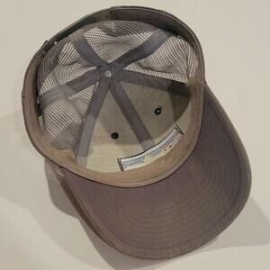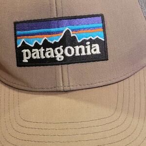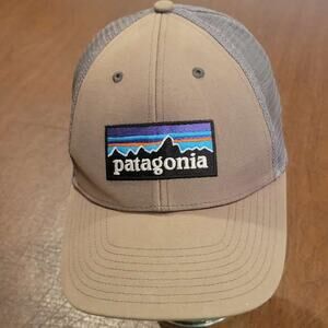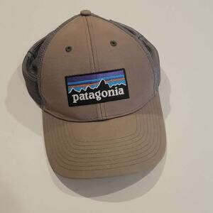 Patagonia Snapback Trucker's Hat Cap mesh back one size fits all Khaki Purple Logo. Pre-owned, perfect shape, please see photos for details.