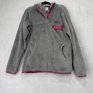 Patagonia Sweater Womens Large Gray Pink Hooded Fleece Pullover Synchilla Lining