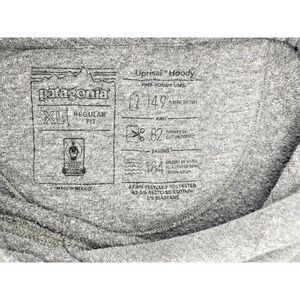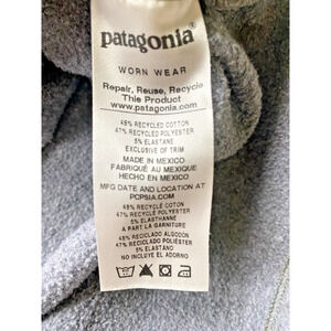 Patagonia Sweater Womens XL Worn Wear Gray Pastel Logo Hoodie w/ Pockets. Good used condition. No rips or stains. Fabric shows normal signs of wear/ light piling & cracking on logo.
