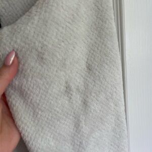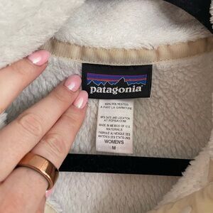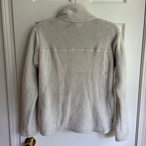 Soft off-white fleece jacket by Patagonia. Patagonia’s craftsmanship is hard to beat! Sweater is not my style but could be yours! A small stain on the left upper arm. Hardly noticeable but appears slightly grey.