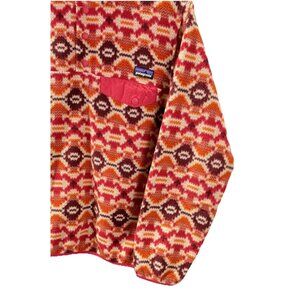 Stay cozy and stylish in this Patagonia Synchilla fleece pullover, featuring a bold Aztec Western-inspired design in a solid red hue. Crafted from soft polyester fleece, this classic Snap-T style offers warmth, comfort, and functionality with its mock neck, snap-button closure, and convenient pockets. Perfect for winter outdoor adventures or casual layering.