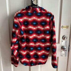 Stylish Patagonia fleece pullover with a vibrant red and blue pattern. Features a button-up collar and a chest pocket.