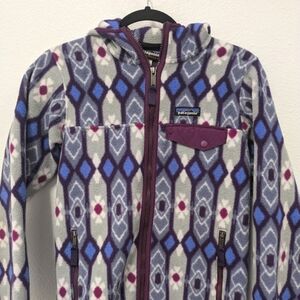 Patagonia Synchilla Gray/Purple Fleece Hooded Jacket sz XS Geometric Cozy