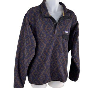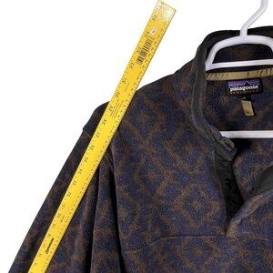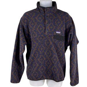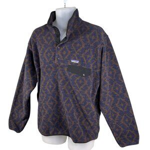 Patagonia fleece vintage pullover Synchilla jacket cold weather wear geometric pattern snap closure warm outerwear men's jacket blue and brown fleece pullover winter clothing stylish fleece adventure wear