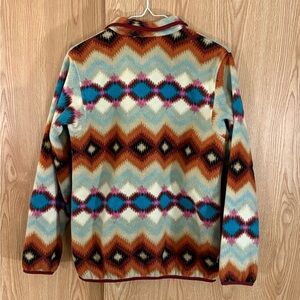 Warm fleece with earth tone pattern. Features a classic design and soft texture.