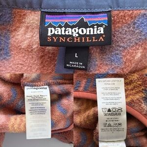 This rare Patagonia fleece features a striking Aztec-inspired print in desert rose, orange, brown, indigo, and ecru. The cozy Synchilla fabric is perfect for layering on chilly days, while the classic snap-button collar adds timeless outdoor style. Great for hiking, camping, or everyday casual wear.