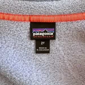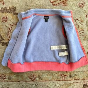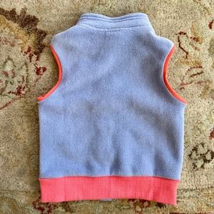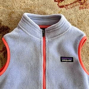 Patagonia Synchilla Vest in Light Current Blue. Color is a bluish lilac with bright coral trim. Size 2T.
