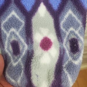 There are two spots with blue paint. Back right forearm and a small spot on front right cuff.