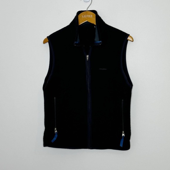 Patagonia Synchilla fleece vest. Black with blue accents. Zipper front and zipper pockets. Well loved, still in good condition.