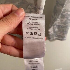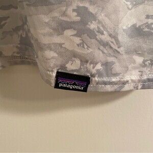 This women’s long sleeve shirt is from Patagonia. It’s a base layer design that is perfect for layering or outdoor activities like hiking or camping. Made from their signature breathable Capilene fabric. Moisture wicking and quick drying fabric. Light gray and white camo pattern, v-neck. In good condition with minimal signs of wear.