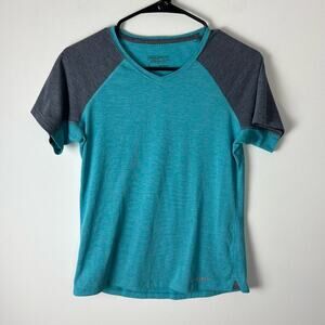 Gently Used Patagonia Short Sleeve Tee Shirt Top. This is a women's small. Light shade of blue/green and gray accents on the shoulders. Slight v-neck to it. Reflective Patagonia text logo around the waist. Lightweight and comfortable! 100% polyester.
