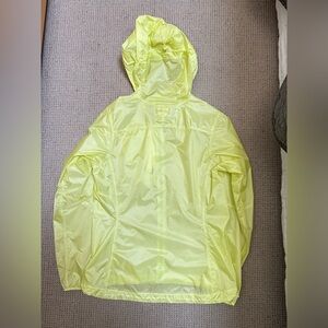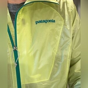 Vibrant neon yellow raincoat by Patagonia. Lightweight and water-resistant. Ideal for running. One interior zipper pocket on chest. Size tag is missing, but otherwise in like-new condition.