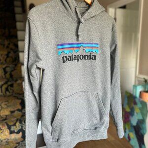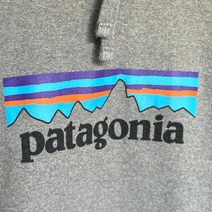 tags: recycled material, sustainable, eco friendly, environmentally conscious, responsible manufacturing, warm, eco-friendly, comfort, comfortable, comfy, cozy, durable, timeless style, bold Patagonia logo, signature logo, outdoor look, outdoorsy, everyday wear, layering, active adventures, active lifestyle, hiking, walking, camping, school, casual, weekends, working outside, travel, packable, travel friendly, road trip, airport, patagonia logo sweatshirt, heather gray patagonia hoodie, unisex patagonia sweatshirt, sustainable patagonia hoodie, patagonia pullover, patagonia recycled hoody, slow fashion, circular fashion, sustainable wardrobe, conscious closet