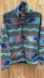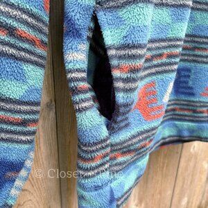 Features: limited tribal print, stand collar, half zip, two side hand pockets, colors of blue teal orange cream and black in a striped tribal pattern, style 25225 from Fall 1995, Made in USA