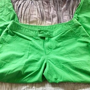 Super lightweight and comfy cropped pants by Patagonia. Beautiful, bright green color. Other details include 1 cargo pocket on bottom right leg, 2 front pockets, 2 back pockets, zip fly with 2 tab button front. Only worn a couple times and in great shape. Size 6. ~25.25" length; ~16.25" waist across laying flat. 100% organic cotton. Feel free to ask any questions.😎💜✌️