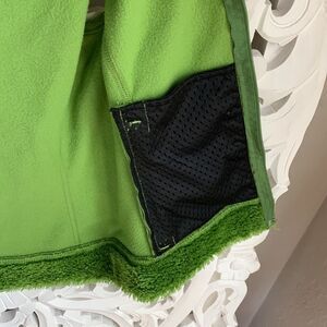 Lime green fleece sleeveless zip up hoodie by Patagonia (the brand’s womens surf line once called Water Girl). Zip pockets with mesh inside. Faux fur detail around hood and at hem. Would be cute for the outdoors or the gym.