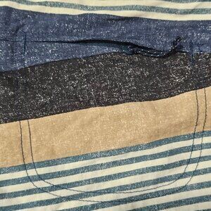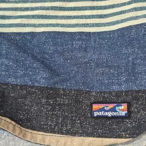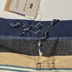 Patagonia Women's Wavefarer Boardshorts in 5" Stripe Texture Tidepool Blue, size 14. These athletic-fit board shorts feature a colorblock pattern with the iconic Patagonia logo accents. Made from a blend fabric, they have a drawstring closure and a mid-rise waist, zipper pocket on back. Perfect for various occasions such as travel, activewear, parties, casual outings, and workwear, these versatile shorts offer both style and functionality for all seasons. Ideal for water sports activities, these tropical-themed board shorts are a great addition to any woman's wardrobe.