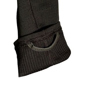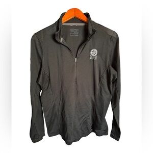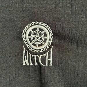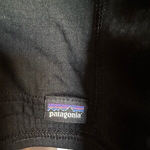 A black 3/4 zip mockneck, lightweight capilene baselayer top, which is very lightly lined fleece. It features thumb straps on the interior of the wrists, the Patagonia logo on the bottom hem and a “WITCH” embroidered patch on the upper left chest. This is designed to be a layering top with fabric breathability and moisture wicking.