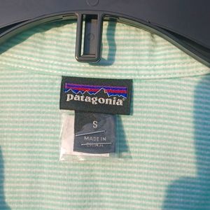 Patagonia Wmn's Sm Green/White Fine Stripe Long Sleeve Button Down Blouse