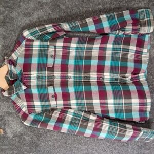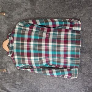 Vibrant plaid shirt with a mix of teal, brown, and magenta. Organic cotton material. Ideal for casual outings. good condition a little of wash wear....measurements are in the listing...plz note it fits fitted at waist. all items are steam, washed with sented detergent. ..