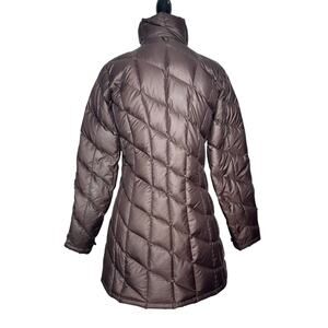 Pre-loved women’s Patagonia Tres 3-In-1 brown quilted insulated goose down fill long puffer parka jacket. Features full zip closure, two front zipper pockets, high neck collar, and stitched cuff logo.