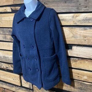• Beautiful double-breasted peacoat with large buttons and a wide collar that opens flat