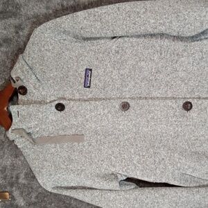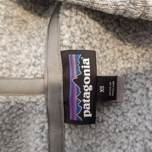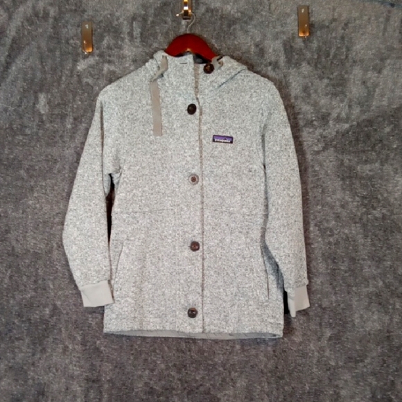 Cozy Patagonia fleece jacket. Soft texture and warm feel. it's in very good condition..has hood n drawstrings...pockets also..measurements are in the listing..