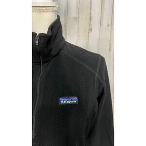 Keywords: Patagonia sweater, women's pullover, black fleece sweater, medium size sweater, regular fit, long sleeve sweater, stand-up collar, Patagonia logo, machine washable sweater, pre-owned women's clothing, casual wear, outdoor sweater, winter fashion, sustainable clothing, eco-friendly brand