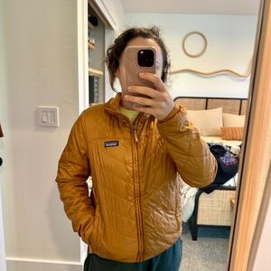 This insulated jacket features a recycled nylon shell with polyester fill, providing warmth without bulk. Designed with a sleek quilted pattern, zip front closure, and elastic cuffs and hem for a comfortable fit. Perfect for layering on hikes, travel, or casual wear. Classic Patagonia quality, eco-friendly construction, and durable design in a versatile brown color.