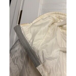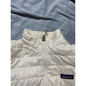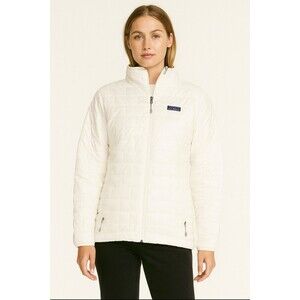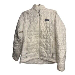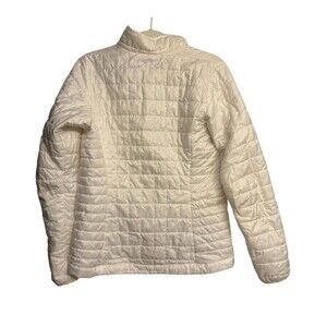 This is a preowned The Nano Puff Jacket is a warm, windproof, and water-resistant insulated jacket that is known for being lightweight and highly compressible. It features a "brick quilting pattern" with narrow horizontal quilt lines that stabilize the insulation. The jacket uses 60-g PrimaLoft® Gold Insulation Eco, which is made from 100% post-consumer recycled polyester and provides warmth even when wet. The shell is made of lightweight 100% recycled polyester ripstop fabric with a durable water repellent (DWR) finish. It has two zippered handwarmer pockets and an internal zippered chest pocket that can also be used as a stuffsack for packing the jacket. The jacket has a stand-up collar and a center-front zipper with an interior storm flap for comfort. It is often described as having a slim profile and being comfortable for everyday wear and layering. This jacket is a white color and has some makeup stains/ discoloration on the neckline.
